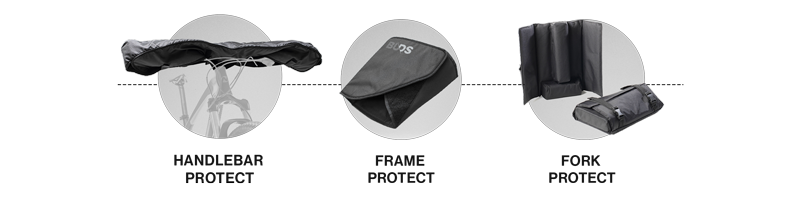 Your bike is well protected inside the bag with the bike protection kit included: Fork, Frame and Handlebar protect.