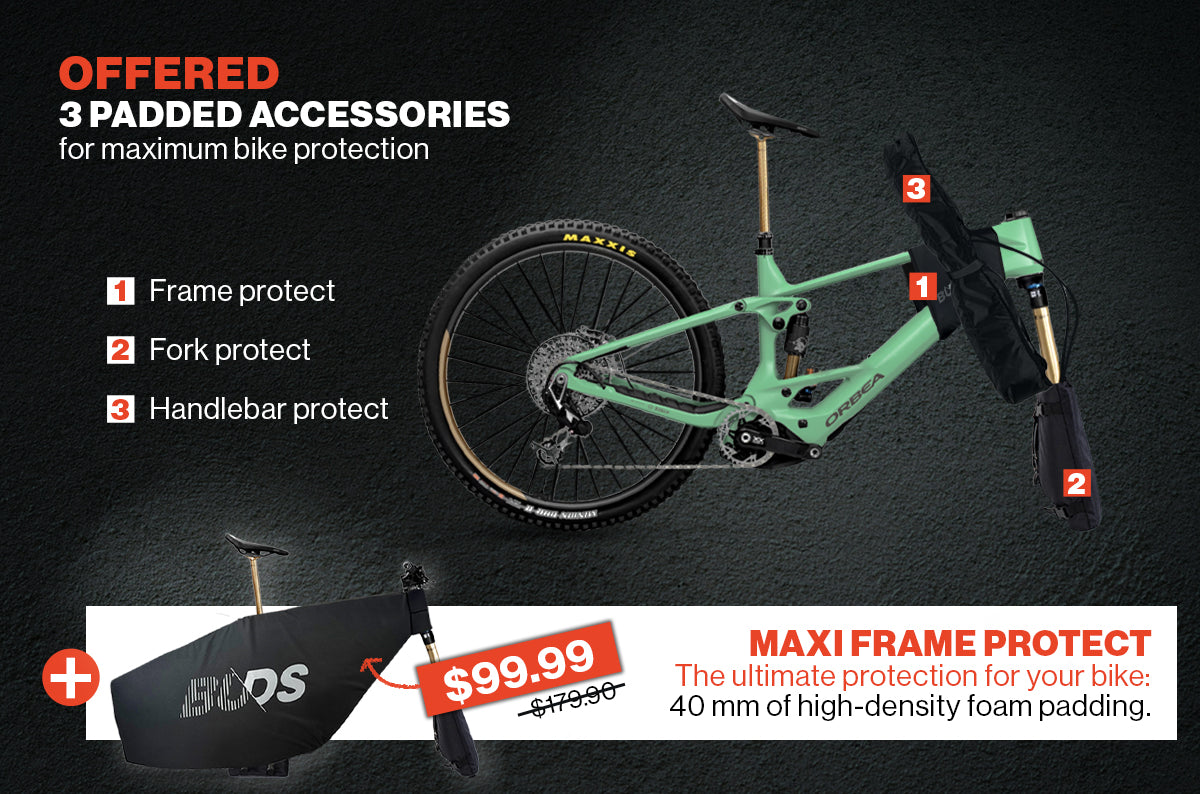 Apart from the bag itself and its large transport bag, we are offering a Fork protection accessory + Frame protection accessory + Handlebar protection accessory.