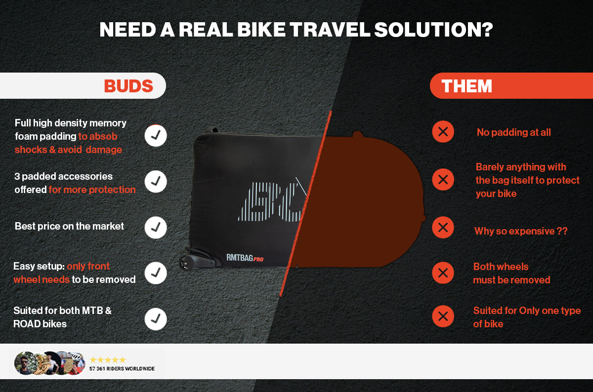Keeping the rear wheel on your Road Bike or MTB changes everything! Time-saving, drivetrain protected, easy handling. Choosing A Buds bike travel bag is the guarantee to transport your bike safely