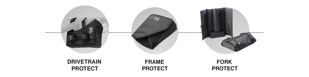 Your bike is well protected inside the bag with the bike protection kit included: Fork, Frame and Drivetrain protect.